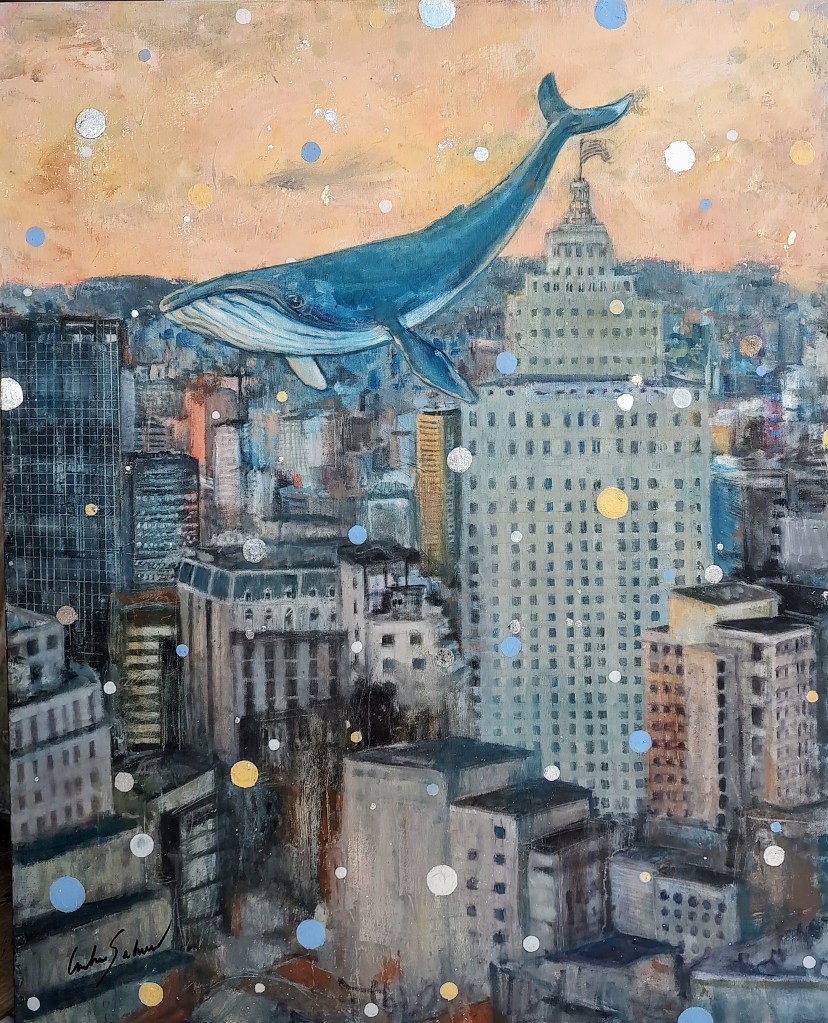 Já a imagem de uma baleia voando no céu de São Paulo traz um lembrete vívido: os oceanos não estão distantes das cidades. Este gesto surreal, ao mesmo tempo poético e contundente, reforça nossa interconexão inegável com a natureza. A baleia, símbolo da vida marinha e de sua fragilidade, atravessando o horizonte urbano, ecoa a urgência dos problemas ambientais que nos alcançam a todos, onde quer que estejamos. O que acontece nos oceanos repercute na cidade, no ar que respiramos, no clima que nos envolve. A obra é, portanto, um chamado à consciência de que a preservação da natureza é responsabilidade coletiva, essencial para o nosso futuro e para o futuro do planeta.
