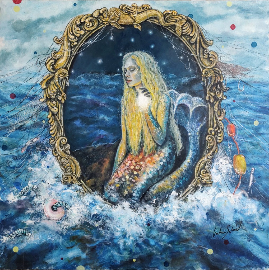 Na obra da sereia, ela emerge de um espelho mágico que funciona como um portal para outra dimensão — um convite à reflexão e à consciência. Com a mão espalmada em direção ao espectador, irradia uma potente luz do centro da palma. Essa luz vai além da estética: simboliza esperança, verdade e o poder da transformação que habita em cada um de nós. É um chamado para dissipar as sombras da ignorância e da negligência que ameaçam nossos oceanos.